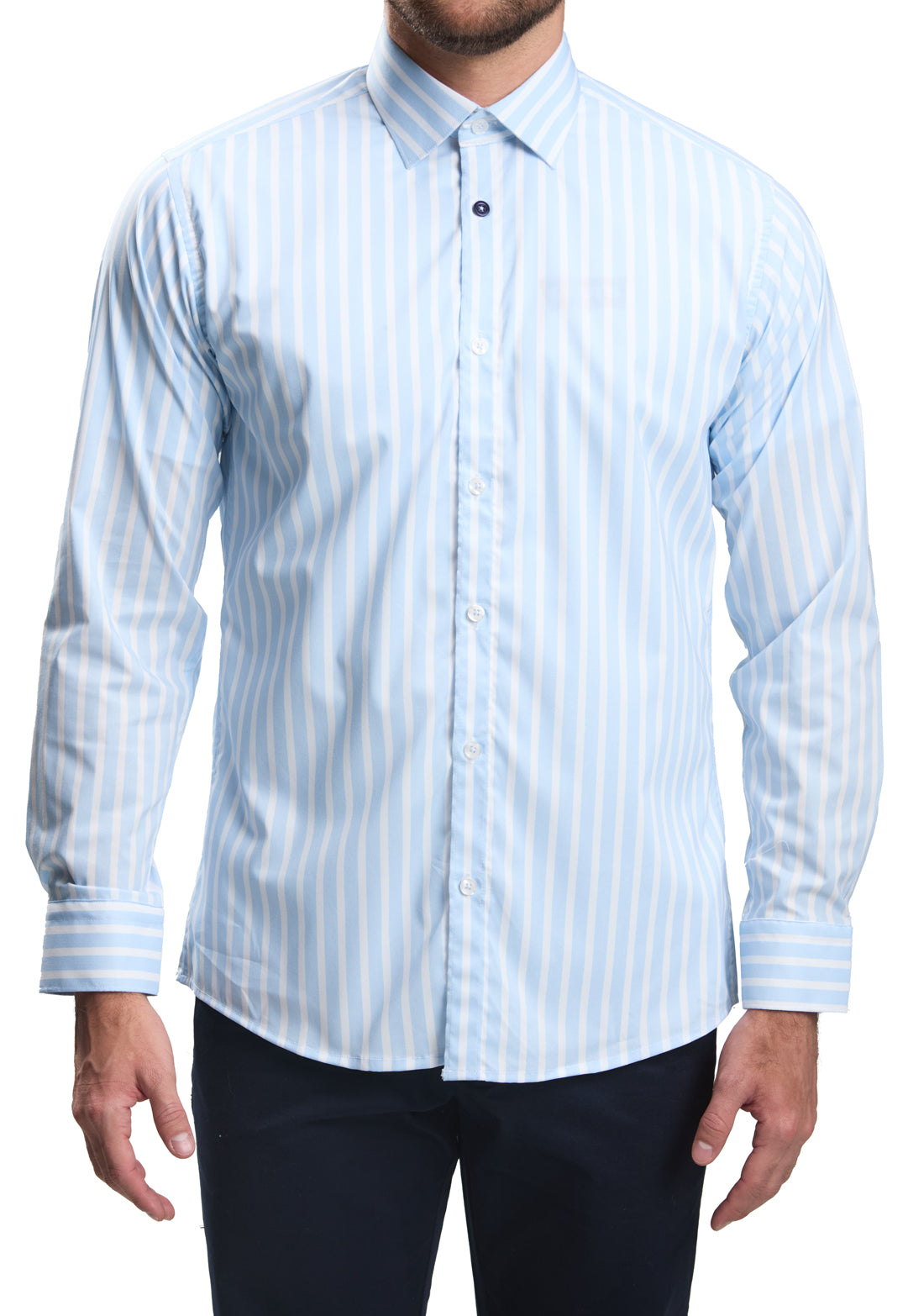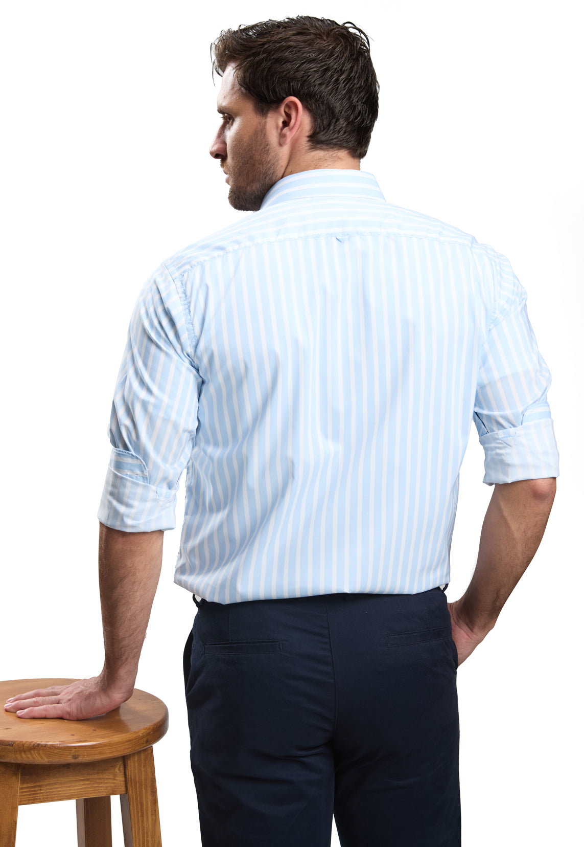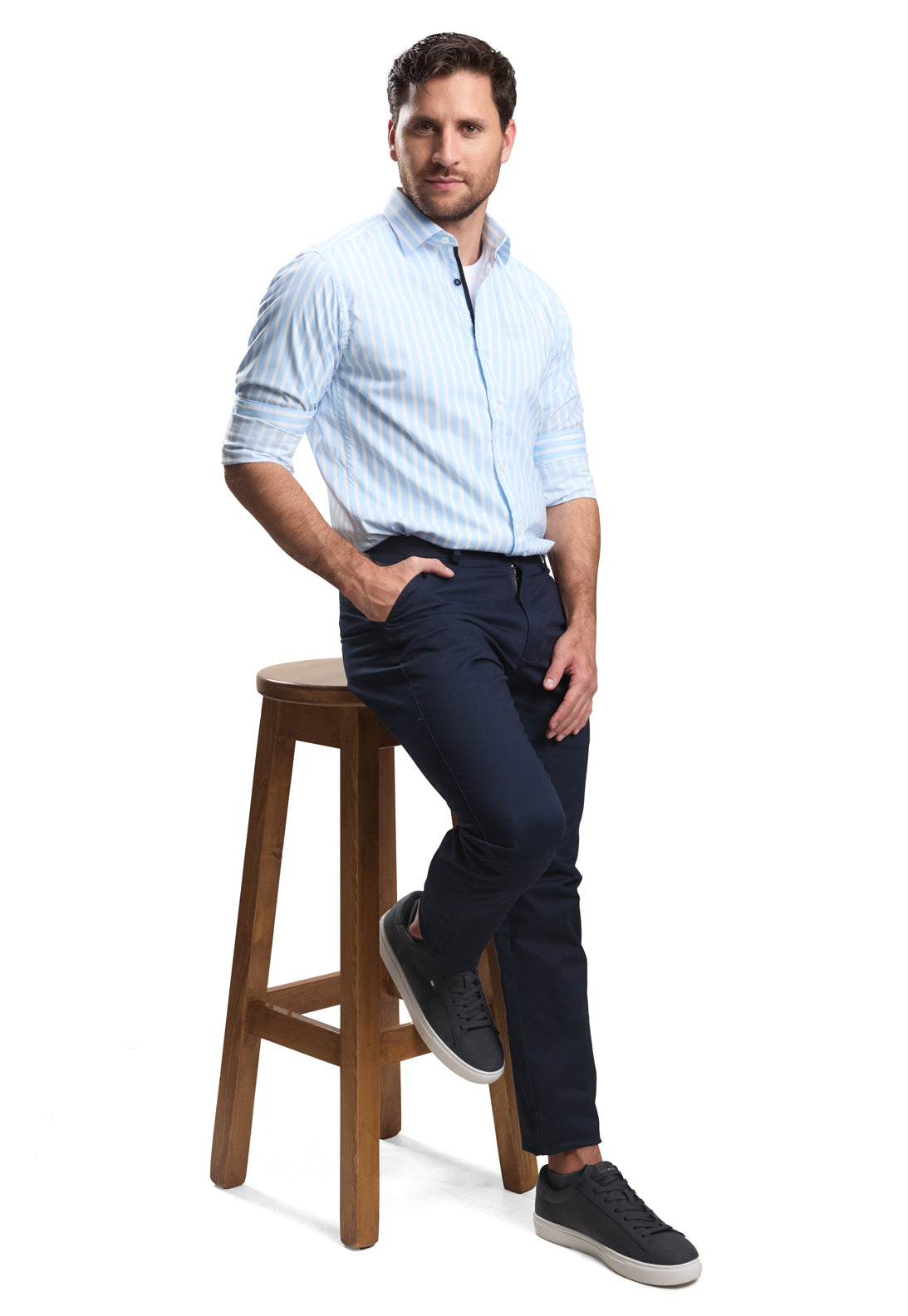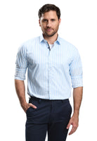 Esta camisa casual slim fit en tono azul con rayas blancas es una prenda versátil pensada para el día a día o para la oficina.