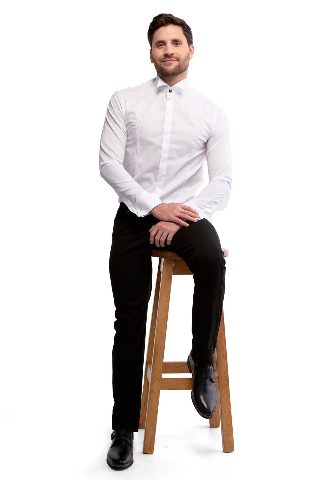 Eleva tu look de gala con nuestra camisa smoking para hombre en color blanco. Confeccionada en una mezcla premium de algodón, ofrece suavidad, frescura y comodidad durante toda la noche.