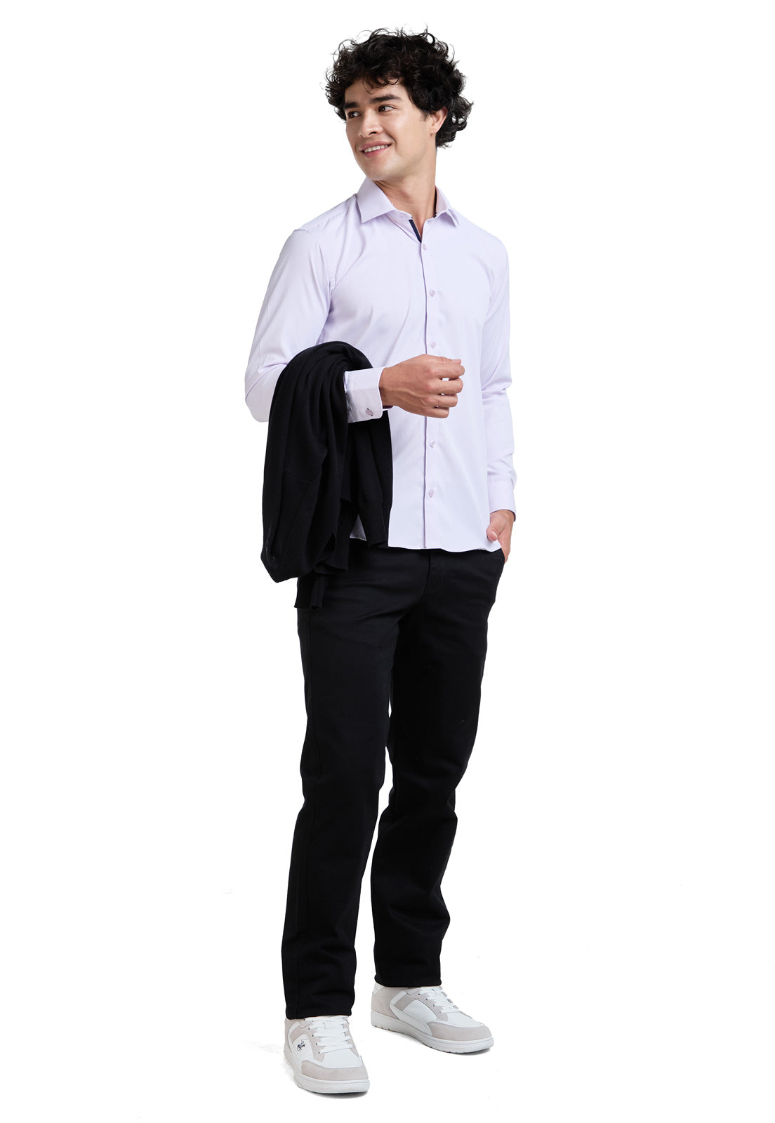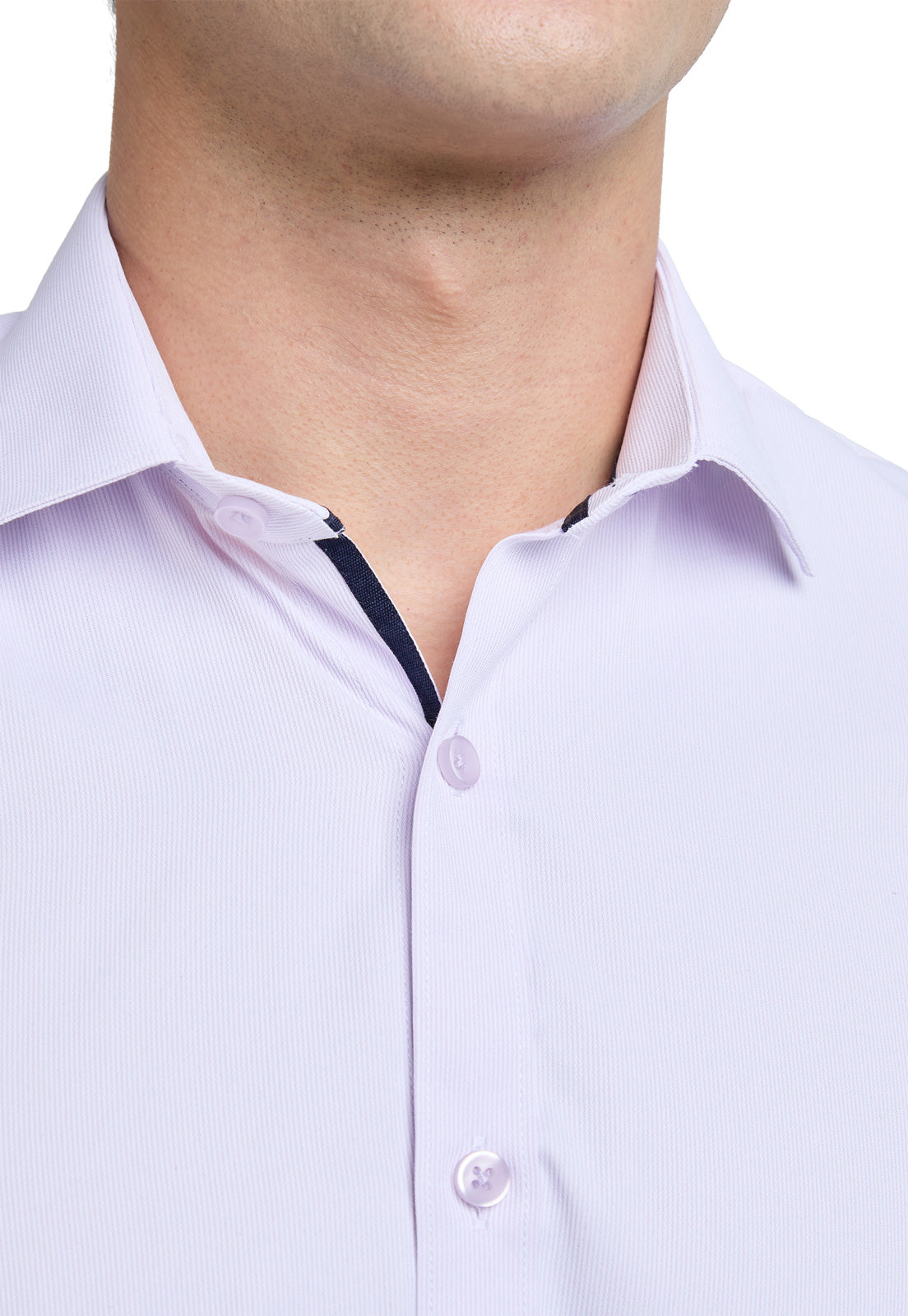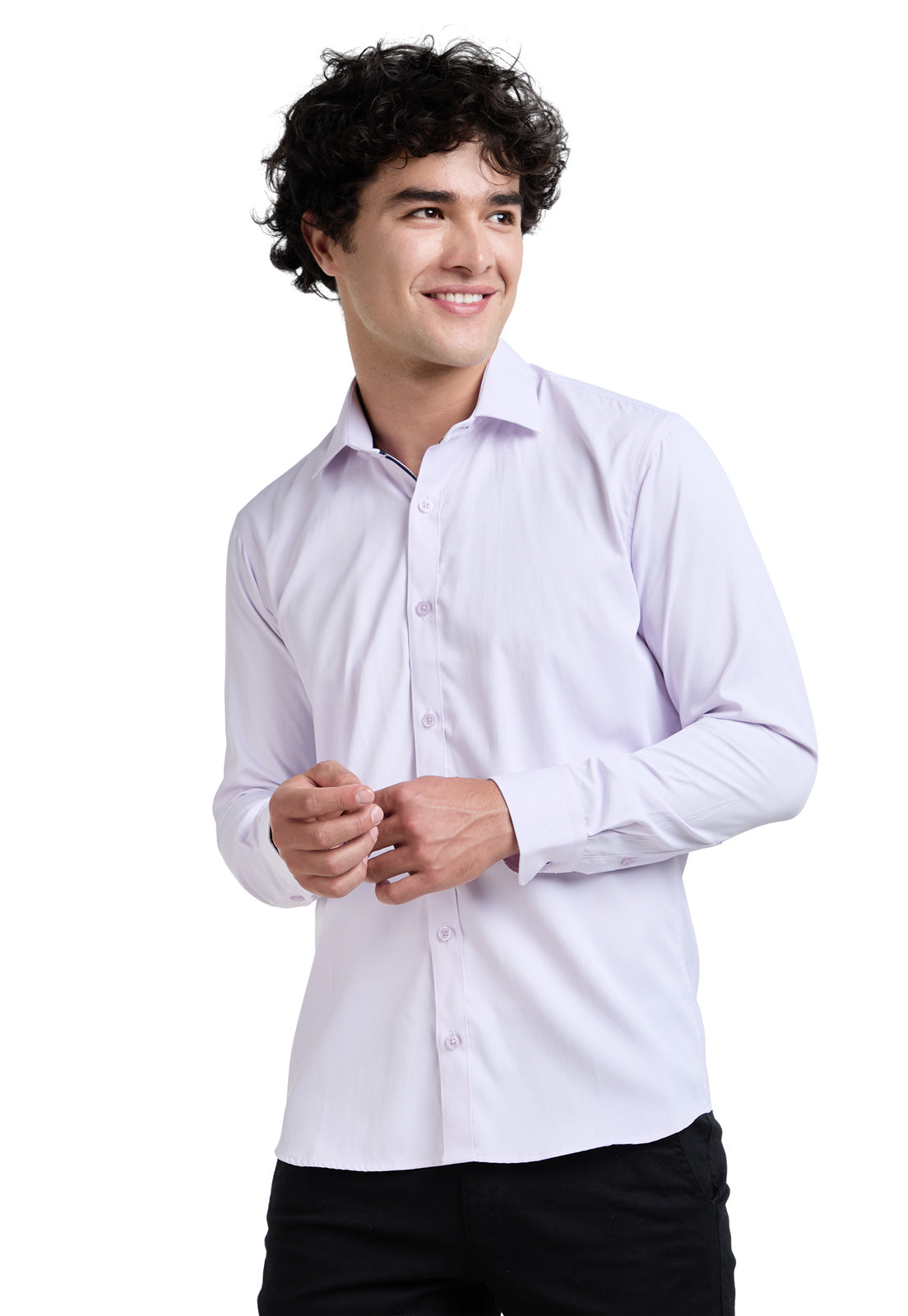 Nuestra camisa lila con rayas es perfecta para darle un toque cómodo y elegante a la hora de vestir, contando con cuello camisero con fusionado ligero, con contraste interno en cinta de pechera, sin bolsillo y un sistema de cierre con botones a tono. Es la opción adecuada gracias a su fácil combinación. Confeccionado por manos colombianas.