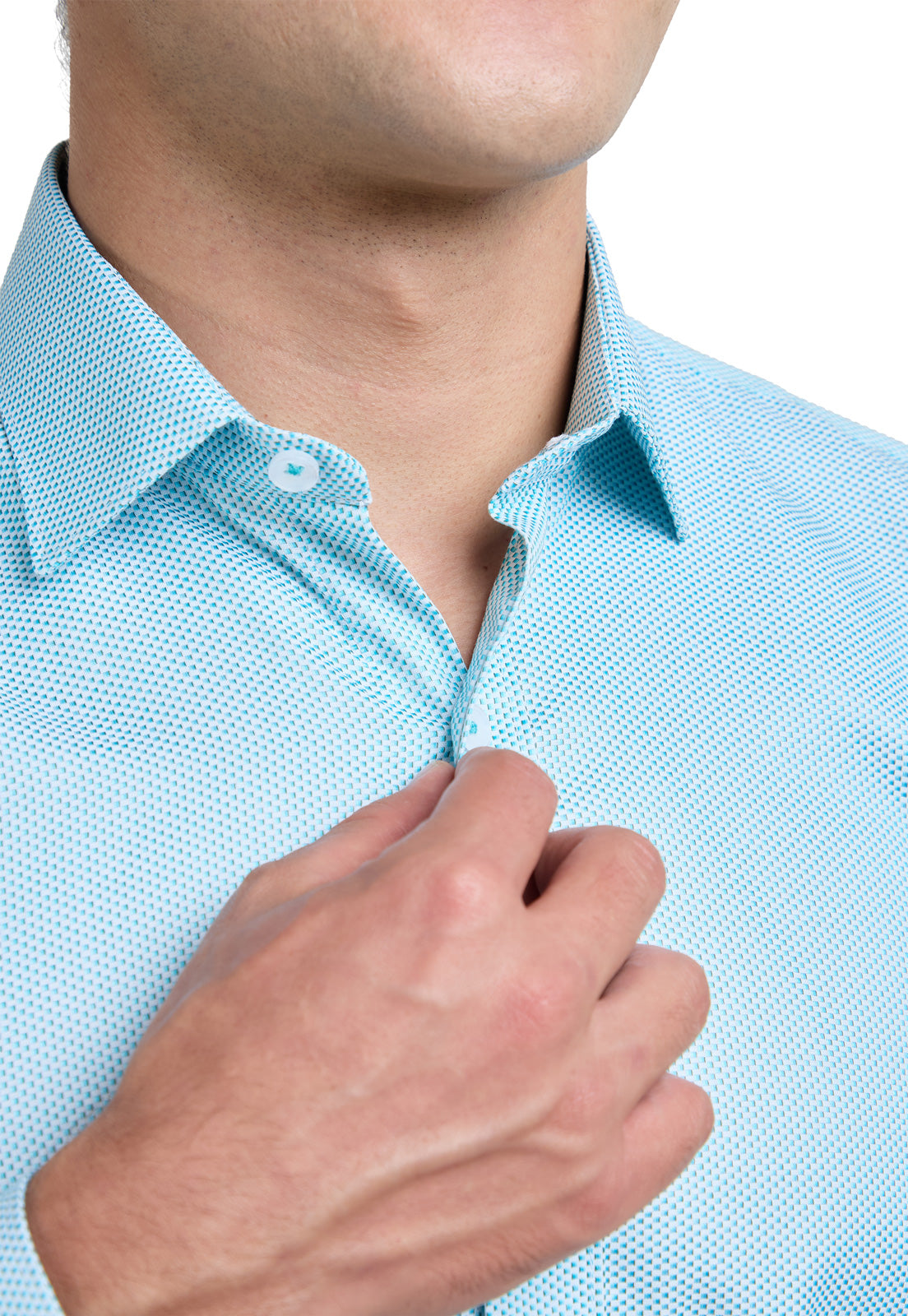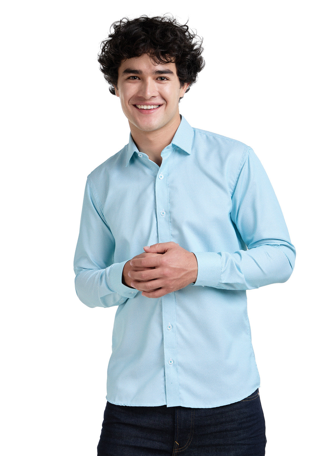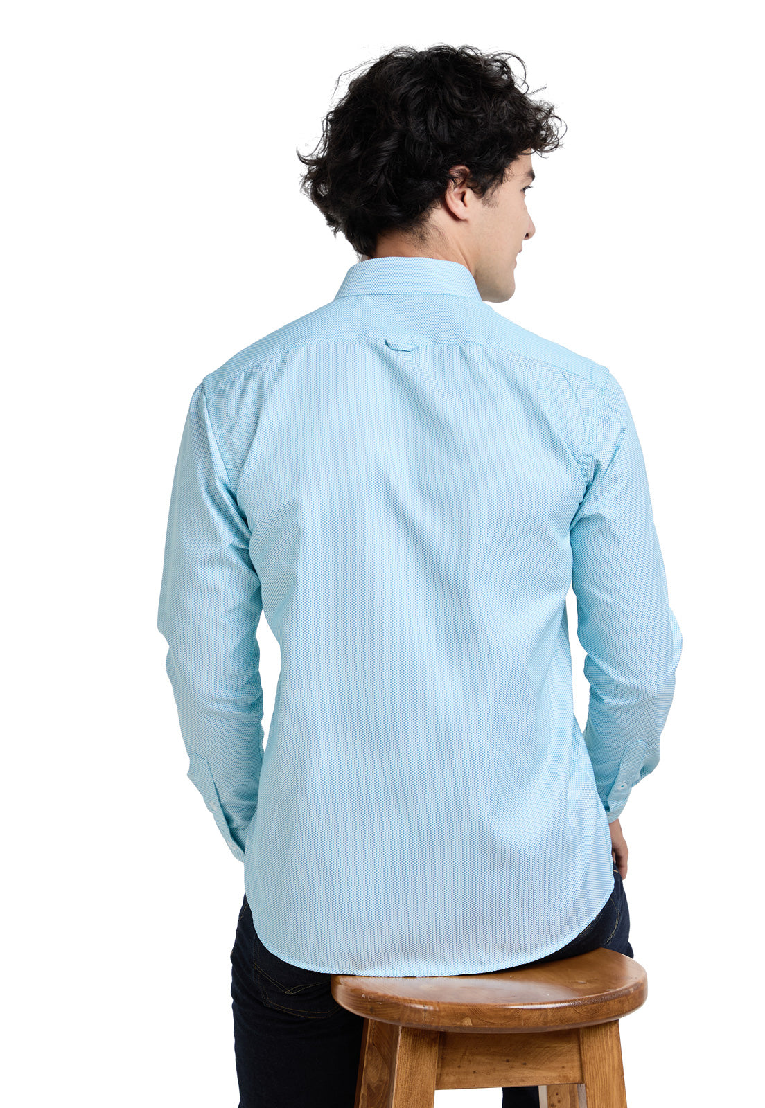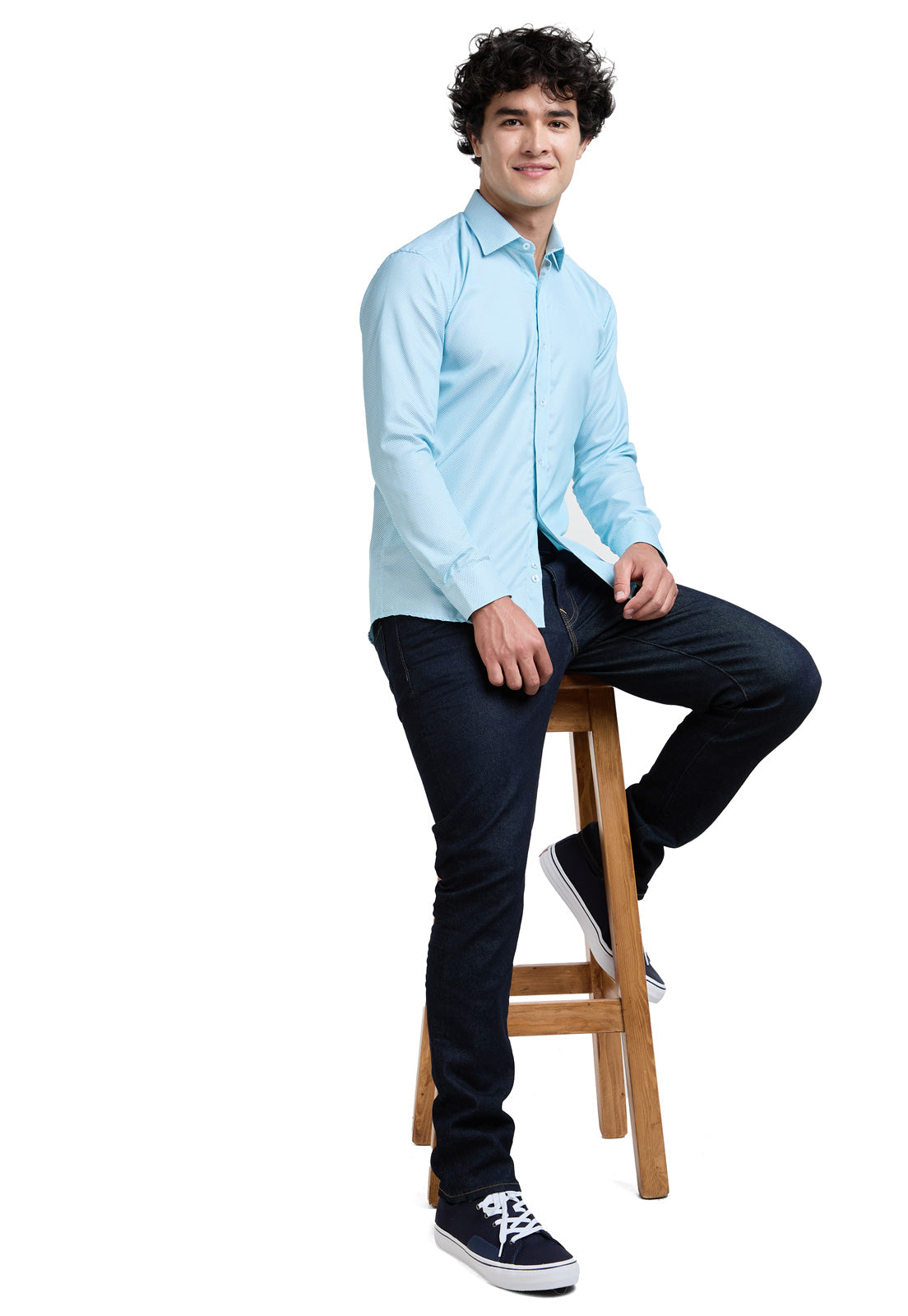 Nuestra camisa verde aguamarina con textura es perfecta para darle un toque cómodo y elegante a la hora de vestir, contando con cuello camisero con fusionado ligero, con contraste interno en cinta de pechera, sin bolsillo y un sistema de cierre con botones a tono. Es la opción adecuada gracias a su fácil combinación. Confeccionado por manos colombianas.