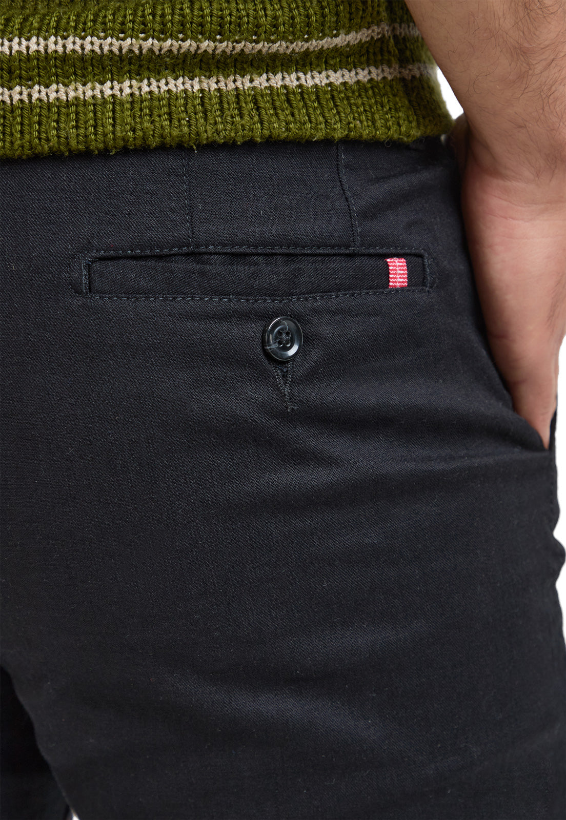 • Bolsillos: Sesgados, bolsillos posteriores ribete, con botón